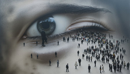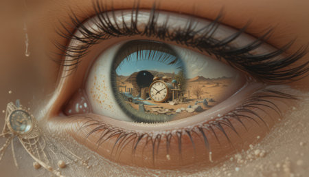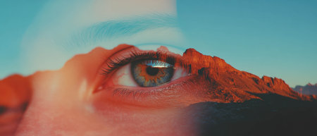 Close-up of a captivating eye blended with a panoramic landscape featuring vibrant mountains