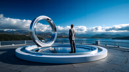 A man in a suit stands in a circular reflective structure with a large metallic ring in the center overlooking a scenic landscape