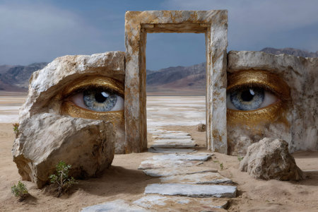 Surreal stone portal structure featuring open eyes with golden eyelids, opening to a desert landscape