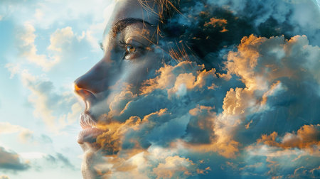 A visually stunning artwork depicting a person standing before a womans face dissolving into clouds, symbolizing introspection and the power of the mind.