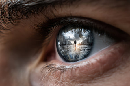 Close-up of a womans eye with a reflection of a vibrant cityscape, showcasing technology and urban life through a creative lens.