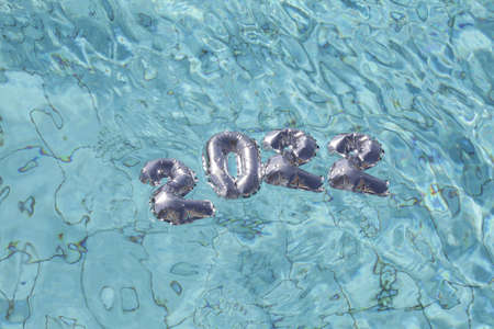 2022 silver balloons floating in blue water in pool. Christmas and happy new year concept.
