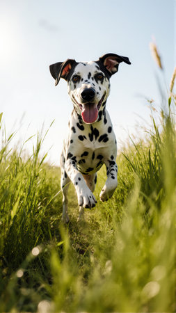 Playful dalmatian puppy running in meadow, joyful spotted canine enjoying the outdoors