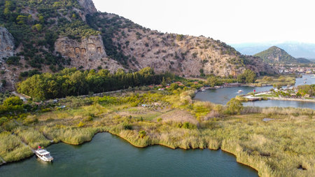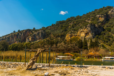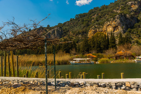 The rock-cut temple tombs of the ancient city of Kaunos in Dalyan, MuÄŸla, Turkey. Beautiful view of Dalyan river with reed beds, excursion boats and carved tombs in the background.