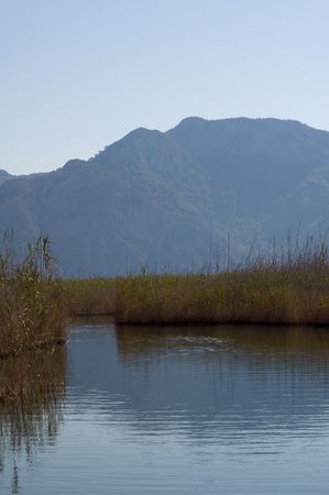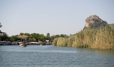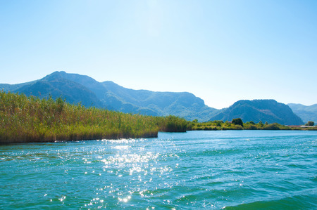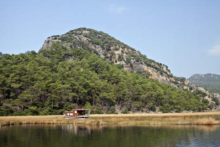 Turkey. Boat trip on the Dalyan river with mountains in the background.