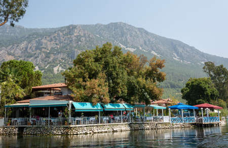 Akyaka, Mugla, Turkey - July 30, 2016. Restaurant along the Azmak stream in Akyaka village in Mugla province of Turkey, with people.