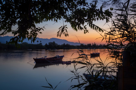 Azmak River, Akyaka, Mugla, Turkey. Nature composition. Summer Background. Countryside landscape with lake. Boat sails on the Azmak River. People are taking tour on Azmak River in Akyaka Village.