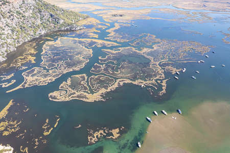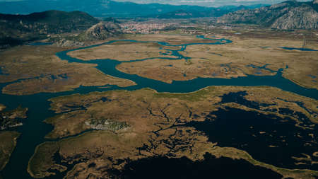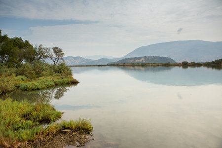 Spring day in Albania. View of banks of Buna River, Lake Shkoder and city of Shkoder