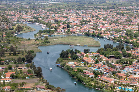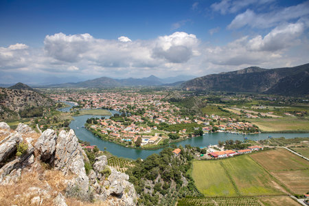 Dalyan - Mugla - Turkey, October 22, 2024, Beautiful Dalyan river view from the rock-cut temple tombs of the ancient city of Kaunos.