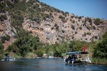 DALYAN, MUGLA, TURKEY: Rock-cut temple tombs of the ancient city Kaunos in Dalyan. Dalyan river view with ferry boats and carved tombs at background.