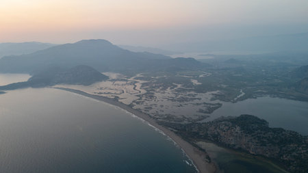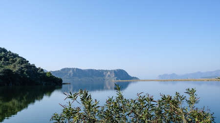 Stunning coastal scenery with Iztuzu Beach, Hill in Dalyan in Turkey. Beautiful nature landscape sea bay view with mountains range