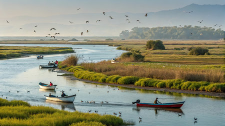 Fishing boats and seagulls in the Danube Delta, Romania