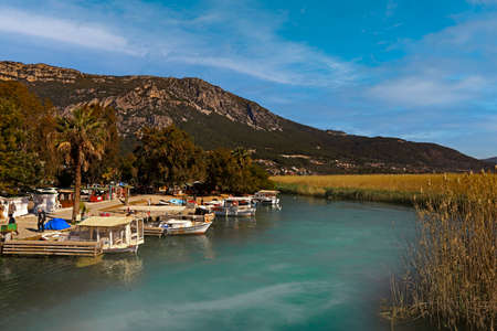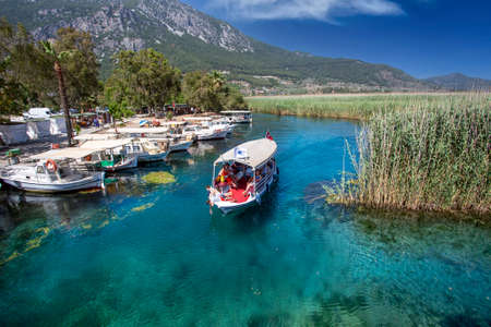 (Muğla - Turkey 05 February 2021) Travel boats in Akyaka, Kadın Azmağı Stream, one of the favorite places of tourism.