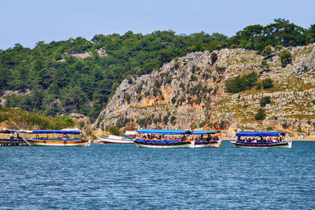 Dalyan river, Turkey - April 29, 2012: Pleasure boats with tourists