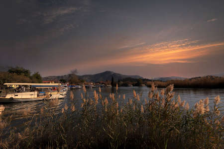 (Dalyan - Mugla - Turkey 05 February .2021) Cruise boats on the river between Köycagiz Lake and Iztuzu beach in Dalyan.