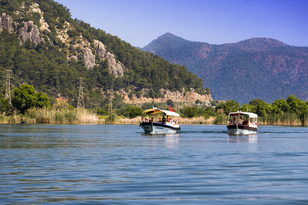 DALYAN, TURKEY - MAY 31, 2015 : Touristic boat trips in the river between Koycegiz Lake and Iztuzu Beach in Dalyan.