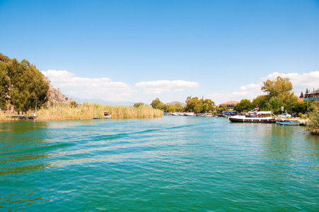 TURKEY, MUGLA, DALYAN, - 5 MAY, 2017: The Dalyan River with tourist boats in the straits of the river