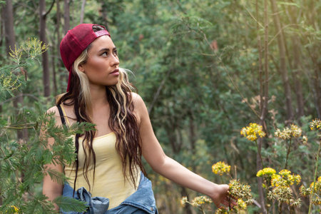 A young white woman with mixed colored hair walking in a forest while touching some yellow flowers with one of her hands