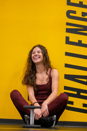 Fitness enthusiast enjoying a break during a workout session at a gym with a bright yellow wall and motivational words