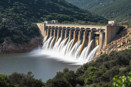 A hydroelectric dam nestled in a verdant landscape, water flows through the dam generating clean energy.