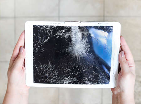 Broken phone, glass in cracks, blue sky reflected in the surface. Despairing, silence, loss of hope. The background is blurred. Vignetting, copyspace.