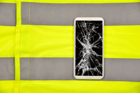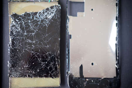 Mobile phone device broken and cracked abandoned on street concrete ground