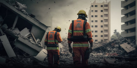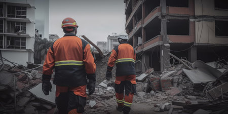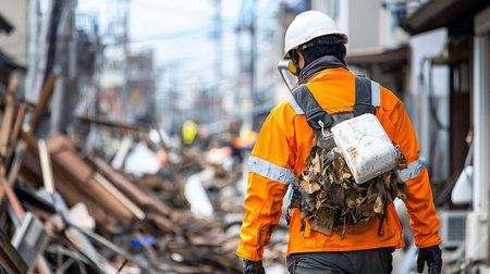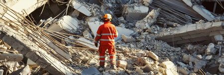 Rescue worker wearing orange overalls and safety helmet evaluating the damage after a devastating earthquake, amidst the rubble of collapsed buildings