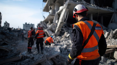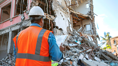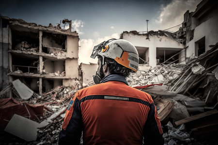 Rescue worker wearing safety vest and helmet is assessing damage on destroyed building after earthquake, facing difficult aftermath of natural disaster