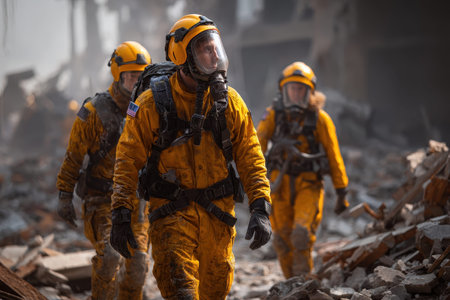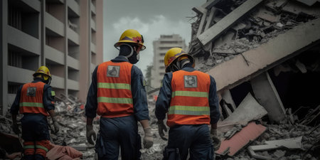 Emergency responders working amidst wreckage. Rescue team providing assistance and support after collapse, apocalypses or city bombing during war. Generative AI