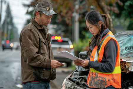 Insurance Agent Inspecting Car After Accident Or Crash, Using Tablet. Expertly Examining