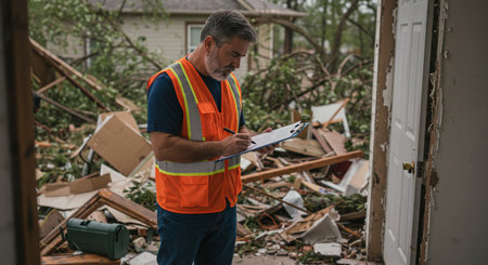 An insurance adjuster inspecting structural damage after a natural disaster, clipboard in hand