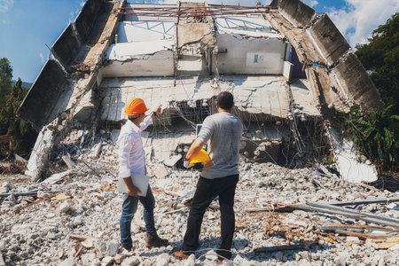 Engineers Carefully Inspecting a Heavily Damaged Building After an Earthquake to Assess the Structural Integrity and Safety Needs for and Reconstruction
