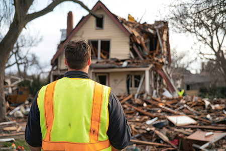 Emergency responder inspects damaged building and debris, representing disaster recovery, safety assessment, and structural inspection.