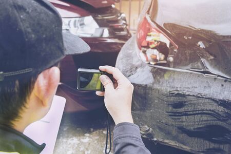 Close-up hand holding smartphone and take photo of car accident for insurance.