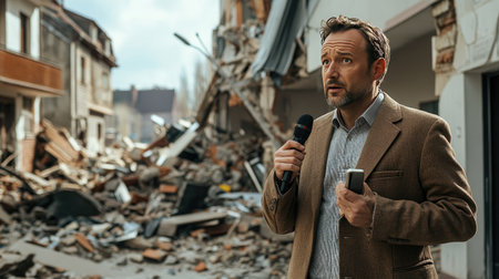 A news reporter on the scene of an earthquake, standing in front of a damaged building with debris in the background, microphone in hand.