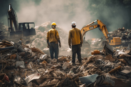 Rescue workers examine a collapsed concrete structure after a disaster, symbolizing the critical work of first responders in disaster management and recovery