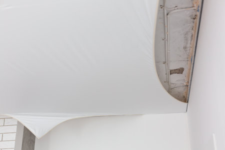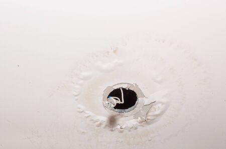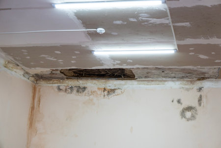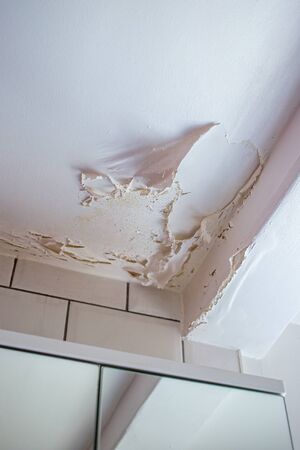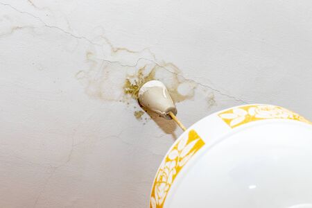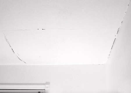 Water leak on white ceiling, insurance accident because of neglect disorderly careless neighbours.