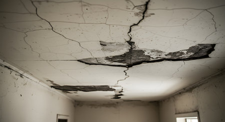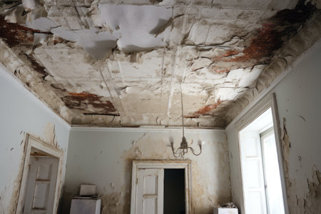 cracked ceiling plaster from water damage, created with generative ai