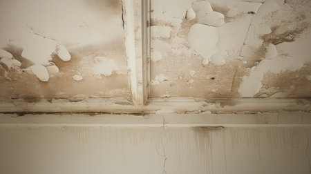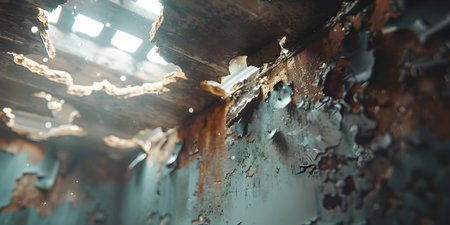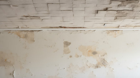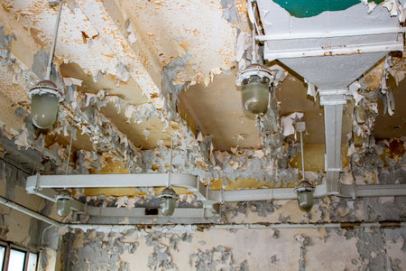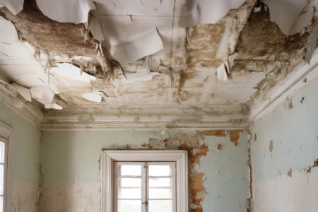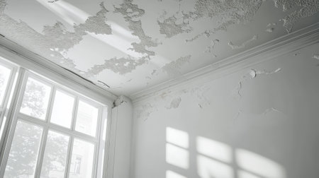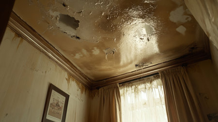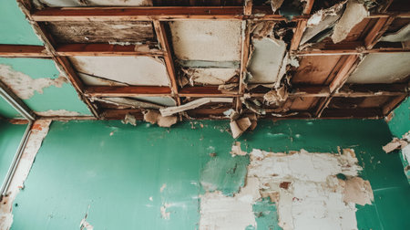 A close-up view of a deteriorating room showcasing a damaged ceiling, peeling paint, and an overall atmosphere of neglect and decay.