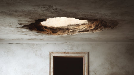 In an abandoned room, a large hole in the ceiling exposes the sky, letting in daylight and highlighting the wear on the walls and floor.
