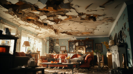 Shot of a home interior with a fallen ceiling after a natural disaster