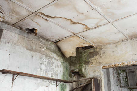Damaged ceiling from water leak in old abandoned house