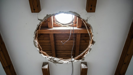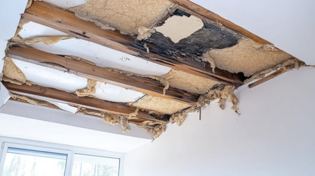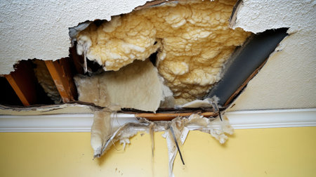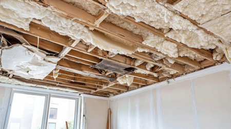 A damaged ceiling reveals exposed insulation foam and wooden framing, indicating urgent repair needs. The setting highlights the unfinished details of residential renovations.