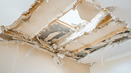 A severely damaged ceiling reveals exposed wood and debris, indicative of water leaks or structural failure in a residential space needing urgent repair.