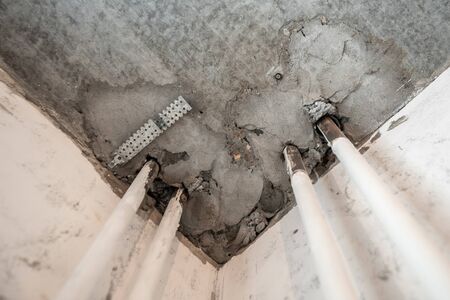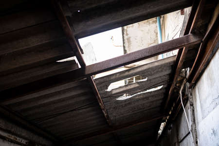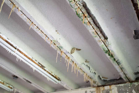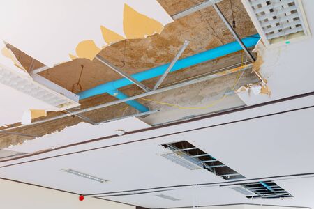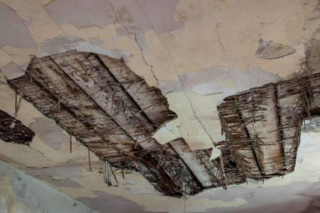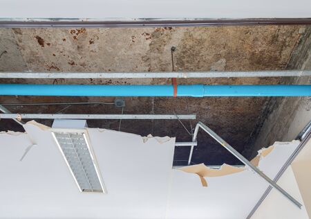 Water damaged ceiling in an old abandoned house.broken damaged ceiling with hole pipes