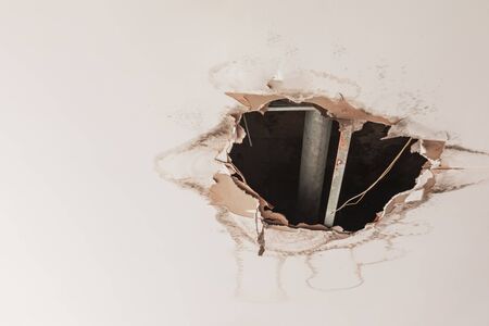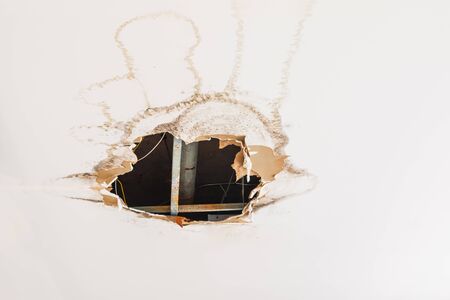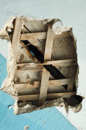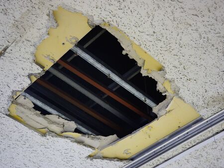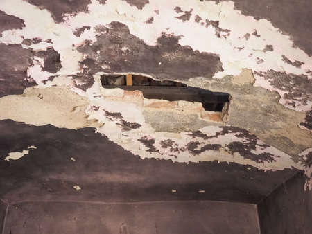A hole in the ceiling of an old building. The ceiling is broken.