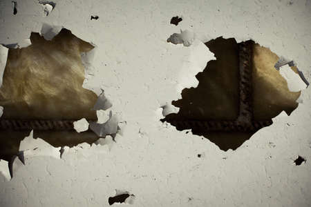close up damaged walls with peeling paint and plaster and small nail or screw heads in the exposed areas