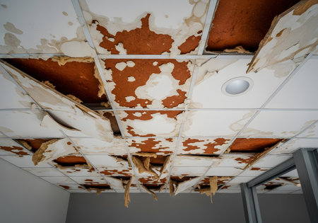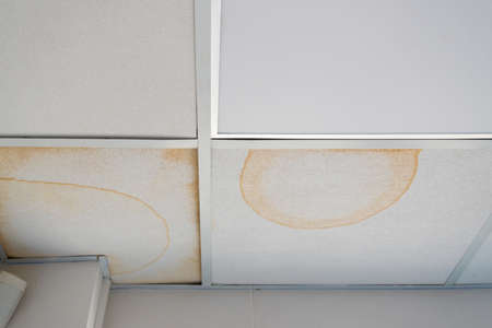 Water damaged ceiling roof brown stain office building