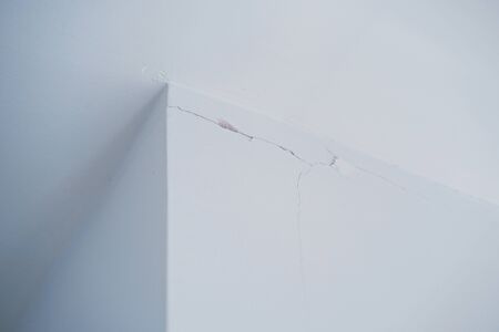 A crack in a white ceiling of a generic, unidentified old house, and a crack in the corners where the wall joins the ceiling, resulting from water leak and tectonics, showing a bulged panel that is in danger of falling off