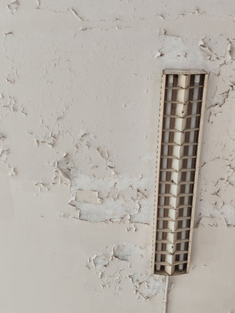 Derelict Soviet factory interior. Grimy industrial lamps hang amidst extensively peeling paint on walls and ceiling, showing severe decay and neglect